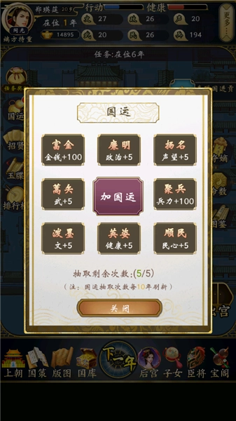 6、拥有五次抽取国运的机会,次数耗尽后需每十年刷新一次。