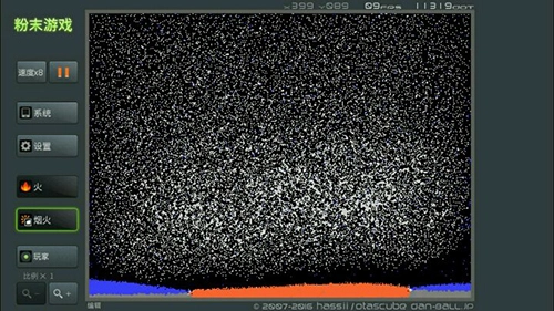 粉末画面极为简洁,呈现一片空白,当下的场景与玩法需由玩家自行设计,仅提供一个平台。操作也很简单,只需在设定好大小的区域内添加“粉末”来构建小小的新世界,变化的粉末让普通的方式变得有意义,从蚂蚁、战士、风、火、水、岩浆到玻璃、沙、种子、云等,选定后往屏幕上轻轻挥洒,粉末便会遵循自身固有规律运作,你永远无法预料两种粉末相遇时会发生怎样的物理、化学变化。