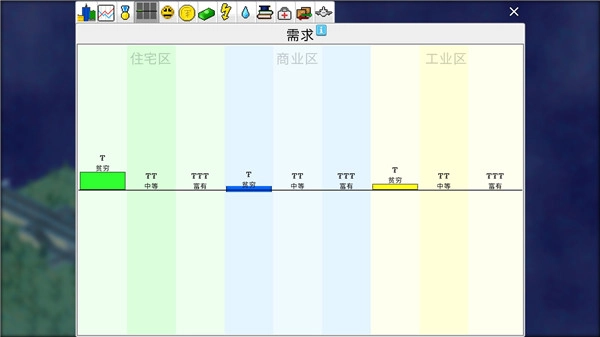 (商业)可于住宅区周边规划商业I/商业II/商业III级区域并开展建设。在商业区内,既可以等待居民自主发展,不过存在商业区全为披萨店的概率。在建造界面中,需选择“带公路”的选项进行铺设(沙盒模式除外,带公路的建造会产生额外费用,区域自带的公路均为运输系统里的城市道路)。