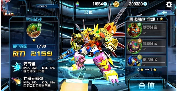 合体所需机甲包括:草莓战宝、葡萄战宝、集结战宝、蜜桃战宝、小果战宝、香橙战宝、菠萝战宝。
