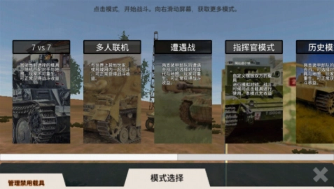 6、装甲纷争里有遭遇战、联机、指挥官等九种模式,点击对应模式就能开始战斗,向右滑动屏幕还能查看更多模式。