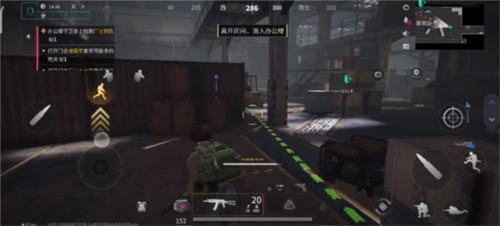 4、进入图示界面后,请使用横屏模式操作,左侧按键用于控制移动,右侧按键则对应射击、跳跃、蹲下等功能。