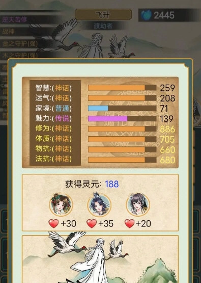 根骨:决定修炼的上限,根骨好的人能够突破更高的境界,还可以提高法宝炼化的成功率。