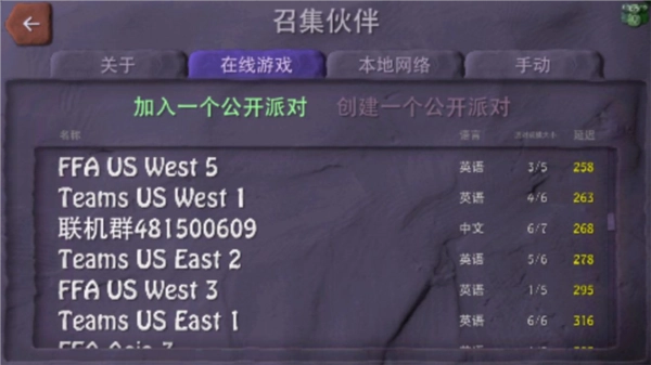 上图是私人房间,输入朋友的IP就能加入。要是你不清楚朋友的地址,让他点击图里的【显示你的地址】绿色文字就行。下面这张图则是全球服。