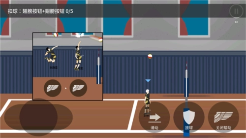 3、连续点击两次翅膀按钮即可完成扣球动作,第一次点击会触发跳跃,第二次点击则执行扣球,操作时可连续点击完成这两个步骤。