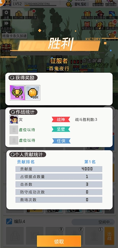 3、英雄远征玩法建议:先派一个英雄出战,打完后如果能轻松取胜,就返回界面重新选一个新的关卡,再派英雄去拿奖励。每个关卡的奖励都挺丰厚的,不用担心没金币。