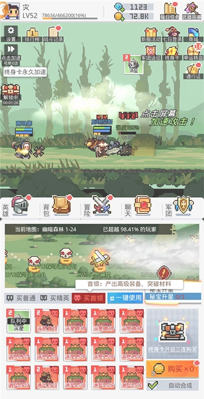 在复古像素风格的世界里,集结你的英雄小队,展开一场轻松又有深度的冒险!你可以收集和培养各具特色的像素英雄,搭配不同的技能组合,挑战层层关卡和强大Boss。放置与策略相结合,让你既能享受挂机成长的轻松,也能体验排兵布阵的策略乐趣。