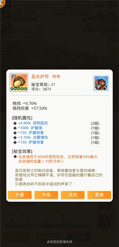 7、关于秘宝洗练,建议优先洗出加护盾的属性,其次是血量,再然后是攻击。可能有部分玩家会忽略这一步,所以在此特别提醒一下。