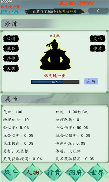 2、人物突破所有境界仅需进行点突破操作。极道境界的提升会增加基础攻速,此过程需要消耗悟道石与灵石。