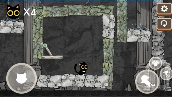 4、进入关卡后,操控小猫前往拉杆所在位置,点击右侧的按钮,就能控制石柱或机关转动。
