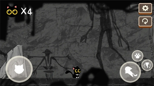 2、进入界面后,左侧可控制小猫移动,右侧可控制小猫跳跃、交互以及使用技能。
