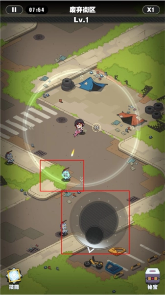 2、进入关卡后,玩家需借助轮盘操控角色移动,角色周边的白圈是视野圈,当僵尸靠近该圈时,角色便会自动发起攻击。