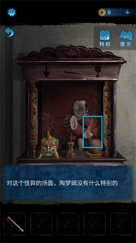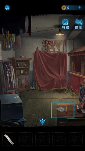 9、通过墓碑通道进入房间后,点击桌上的书籍,获取进一步线索以及写有“开锣大吉”的【封条】。接着,用化妆笔在桌上的颜料盒里蘸取颜料。