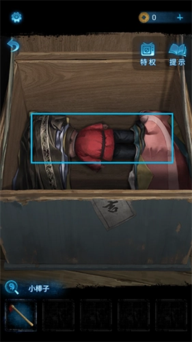 11、进入里屋,在箱子上获取【小棒子】,同时留意纸张上的红色图案信息。