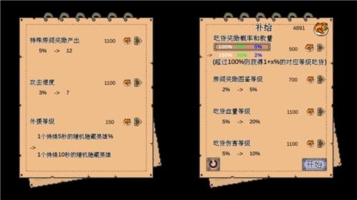 在每一大关开启前,你可以用鸡腿来强化全体英雄的基础属性,而且这个属性加成是永久生效的哦~建议优先把右上角的「吃货奖励概率与数量」点满,这个属性对提升每关结束后三选一英雄的数量和基础品质帮助很大!