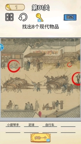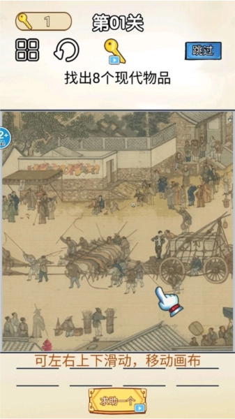 1、任务是在古图里找出所有现代物品,就像图里展示的那样,通过左右上下滑动能够移动画布。