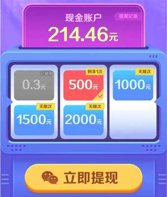 从上图中可以看到,用户若想进行500元提现,需满足以下条件:红包余额达到500元,累计登录应用5天且每天答对80题,同时等级达到30级,即可完成500元提现。