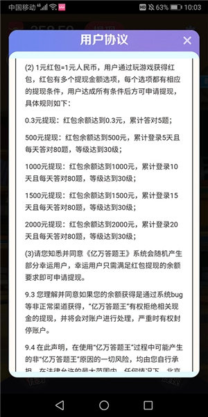 用户协议里明确写着,答对5题就能提现0.3元,这点确实没问题,3毛钱是能提出来的。但后续的提现要求就高多了——要提现的话,得完成每日任务,累计签到到某一天能领一张兑换券,4张兑换券才能换一个提现额度。这个提现额度是用来提现的,可提现的金额得从账户余额里扣,也就是说,想提现的话,账户里至少得有100元才行。