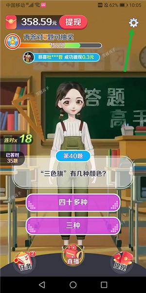 1、进入亿万答题王主页面后,点击右上角的【设置】小图标(即下图绿色箭头所指的图标)