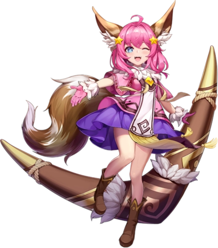 形象设定为一只粉色的萌系猫灵,它手中握着一个和自己体型比例明显不协调的巨型回旋镖。