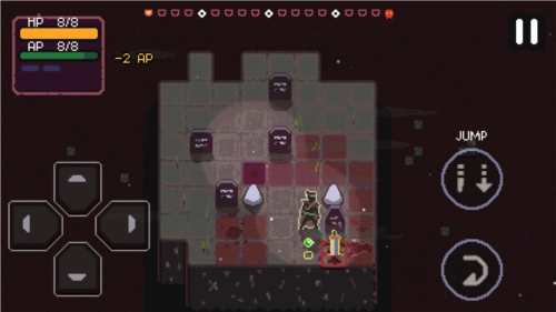 在方格之间跳跃移动,持有剑时能让周围敌人陷入眩晕状态,未持剑时则仅能推动他们。