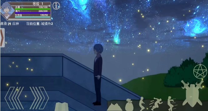 左侧按键控制角色左右移动,傍晚时分来到城镇外,一同欣赏美丽的星空。
