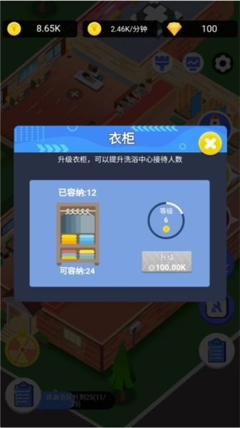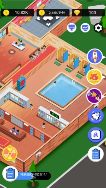 1.上手几乎没难度,特别容易操作,就算没有教程也能轻松掌握,核心机制很简单:经营一家浴室,通过升级设施,一步步把它打造成更豪华的浴城。