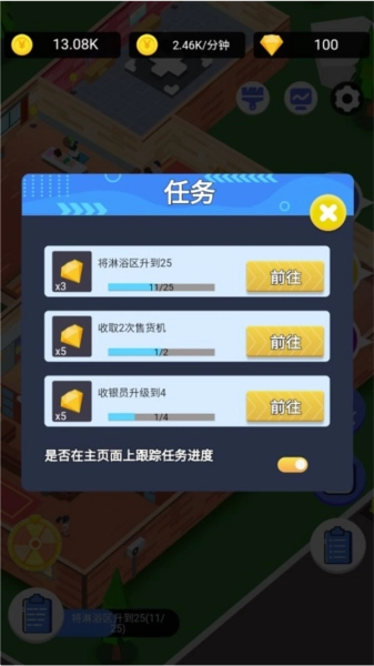 对于新手玩家来说,要是不清楚接下来该做什么,不妨看看下方的任务提示,按照提示来建造和模拟洗浴中心。