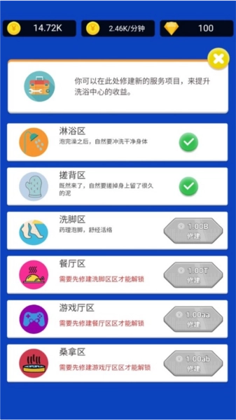 随着玩家资金的不断积累,你还可以建设搓背区、桑拿区、餐厅区、按摩区、街机区等各种各样的服务项目。