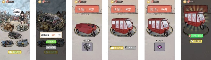具体玩法:进入拼车环节后,可选择价值10万、20万、50万、100万、200万的废铁来组装二手车。车辆估值的波动由底盘、发动机、车内饰、外壳、车标这6个部分共同决定。当车外壳组装完成后选择提前出售,一定能盈利;而随机组装车标后,车辆价值会大幅下跌,导致亏损。
