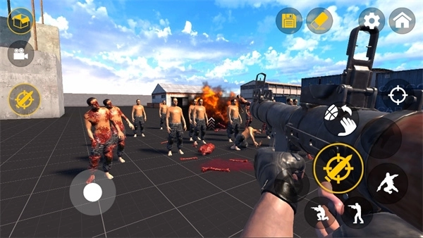1、第三人称视角的低战力角色,挑战模拟僵尸,持枪射击僵尸。