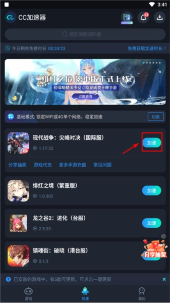 1、在本站打开现代战争尖峰对决,接着启动CC加速器,找到该游戏,点击右侧的加速按钮。