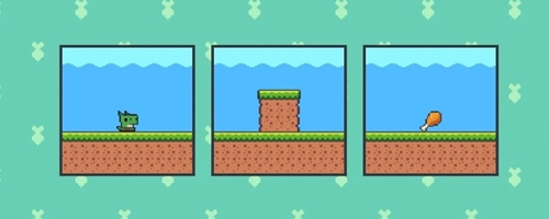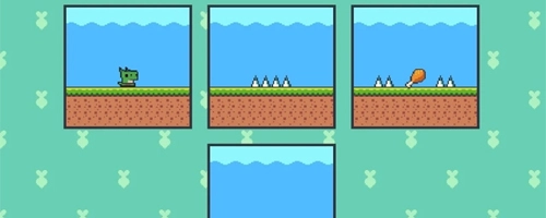 3、进入第一关后,当小恐龙即将走到第一张场景图的边缘时,我们把它和第二张场景图拼接在一起,小恐龙就会进入第二张场景图里;当小恐龙走到第二张图片的边缘时,我们再将第二张图片与第三张图片拼接起来,小恐龙就能成功吃到鸡腿,顺利通过第一关。