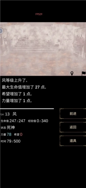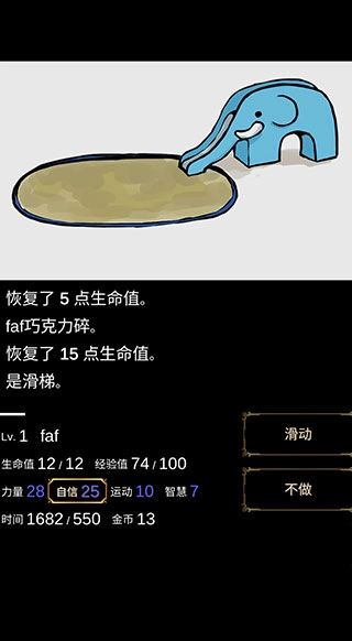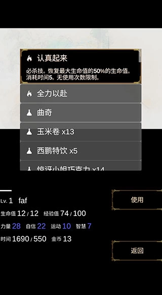 3、屏幕左下角会显示你的等级、生命值、当前时间、金币数量和经验值等信息;在游戏过程中,你将遭遇各类随机事件,面对这些事件时,你可以自行选择是进入战斗状态还是选择逃离。