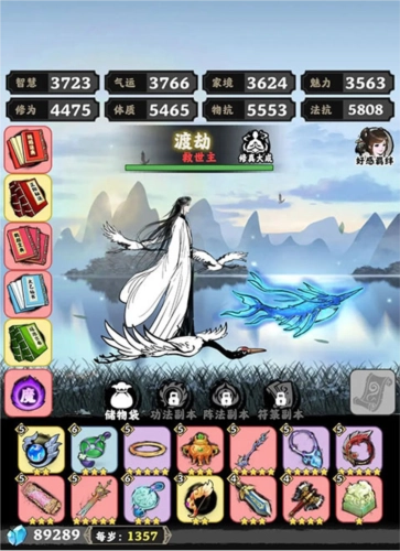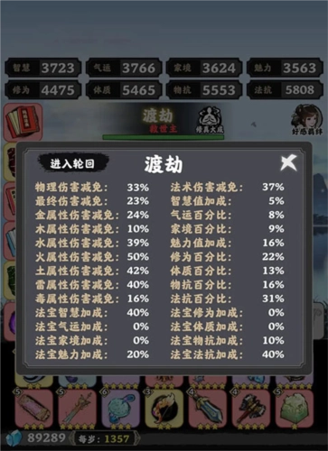 5、丹药:若渡劫时修为不足,可适量服用提升修为的丹药。选择丹药时,优先考虑能增加智慧、气运、家境、魅力这四项属性的,尽量让这四个维度的数值保持均衡。要想顺利通关,这四项属性的总和至少需要达到3200。
