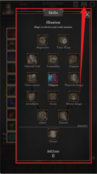6、点击【书本】图标,如图所示,即可查看自己的技能点。