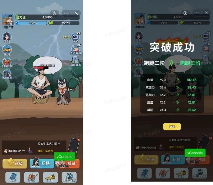 每完成一个订单就能累积一点灵力值,等灵力值攒满后就能触发突破(雷劫),进而进阶到下一等级。