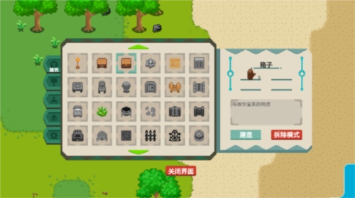 7、点击建筑图标可打开建筑面板,在面板中选择想要制作的物品(例如箱子),系统会显示该物品所需的建造材料,确认后点击建造按钮即可完成制作。