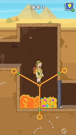 《救救小老弟》是Lion Studios推出的一款益智游戏。玩家将在游戏中化身前往金字塔探险的考古学家,于危机四伏的迷宫里展开探索——既要躲避各类致命陷阱,又要寻觅珍贵宝藏,最终目标是成功逃离险境。游戏采用当下热门的别针玩法,以考古探案为背景并融入剧情故事,让原本单调的玩法变得更具代入感。