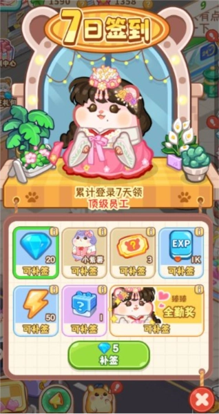 钻石20、精英员工小紫薯*1、豪华招募券*3、经验书*1000、体力*50、神奇道具盲盒*1、顶级员工臻臻*1