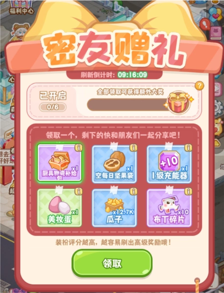 各位店长每天可以从六个选项里选一个领取瓜子、钻石这类礼物,接着分享给好友,等把剩下的五个奖励都领完,就能拿到豪华招募券*1和山竹的礼物*1啦。