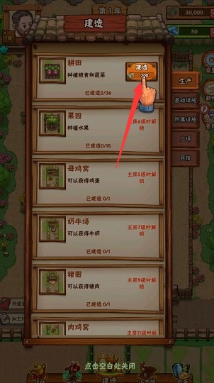 2、点击“构建”选项,接着在“构建”的下拉列表里选中“农田”!等我们把土地耕种好,就可以着手种植庄稼了。