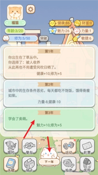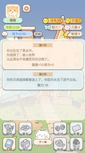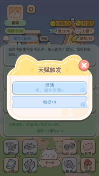 2、天赋与随机事件:在游戏里,玩家得给猫咪挑选天赋,这些天赋会对猫咪的成长和生存能力产生影响。此外,游戏中还设计了多样的随机事件,像天气转变、疾病来袭等,玩家需要灵活处理这些事件,助力猫咪健康成长。