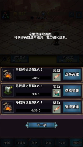 5、这里呈现的是探险场景,玩家在此处还能获取英雄进阶所需的道具、能力强化相关的道具等。