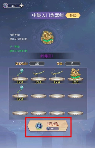 3、我们还能点击炼器,进入后选择锻造,完成锻造就能得到一级法器。再点击一次锻造,又能获得一个法器,把这两个法器合并,就能得到新的法器,我们也会从初级入门炼器师晋升为中级入门炼器师。只要持续合并法器,就能提升法器的攻击力。