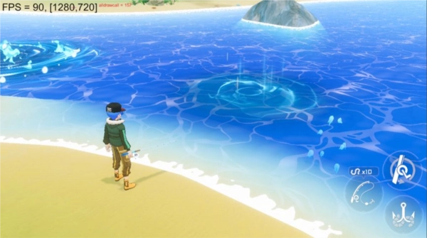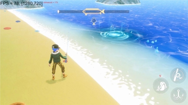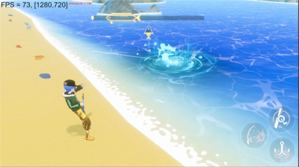 进入钓鱼模式后,右侧的虚拟按键会切换为钓鱼专用按键。只需点击左侧第一个抛竿按键,即可开始钓鱼。需要注意的是,抛竿按键上的数字显示当前剩余的鱼饵数量,一旦鱼饵耗尽,垂钓就会自动停止,因此要记得及时补充对应的鱼饵。若想更换鱼饵,点击右下方的换饵键即可。