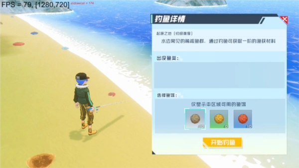 靠近渔场后点击钓鱼,界面会显示垂钓相关信息以及当前持有的鱼饵。建议选择成功率更高的高阶鱼饵来进行垂钓,这样能有效提升钓到鱼的概率。