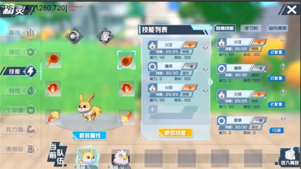 点击幻兽界面左侧第三栏,即可进入幻兽技能培养界面;接着点击“更多技能”,就能查看当前幻兽的技能学习详情。这些技能涵盖了幻兽升级后自动掌握的新技能、通过学习机可获取的技能,以及携带特定组件后能够使用的技能。