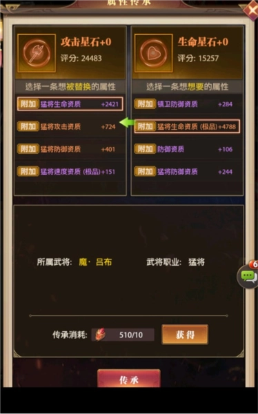 输出系猛将/谋臣:词条可选择双攻击极品橙色词条(普通攻击词条+猛将/谋臣攻击词条),也可选择双速度极品橙色词条(普通速度词条+猛将/谋臣速度词条)