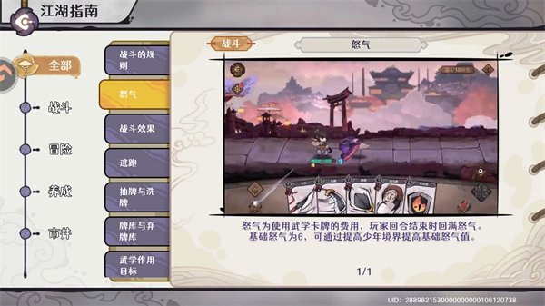 当抽牌机制被触发时,玩家会从牌库中抽取相应数量的武学卡牌到自己的手牌里。要是触发抽牌时牌库中的武学卡牌数量为0,就会启动洗牌操作,洗牌会把弃牌库的所有卡牌打乱顺序后重新放进牌库。怒气是使用武学卡牌所需消耗的费用,在玩家回合结束时怒气会回满,初始的基础怒气值为6,玩家可以通过提升少年境界来增加基础怒气的数值。
